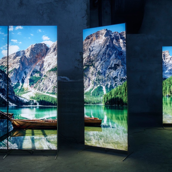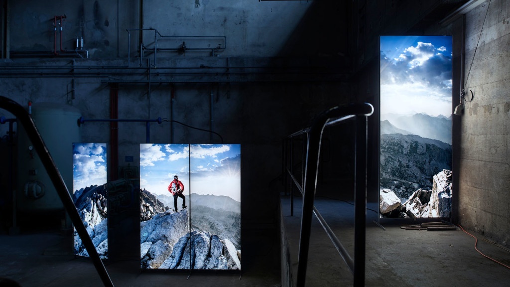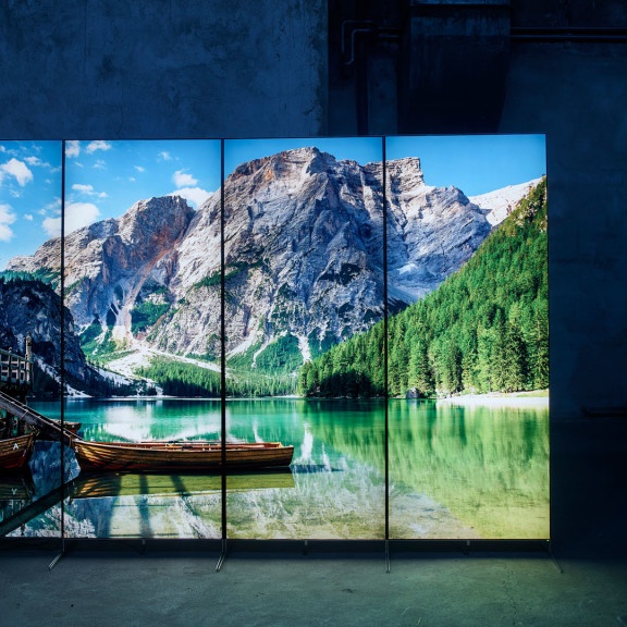 Für die Anwendung gibt es praktisch keine Grenzen: freistehend, ein- oder doppelseitig, mehrteilig kombinierbar in Panorama-Aufstellung, einseitig für Wandmontage oder freihängend mit Deckenmontage. Die Displays lassen sich modular erweitern. Sie werden in einer hochwertigen Tasche mit Rollen geliefert.